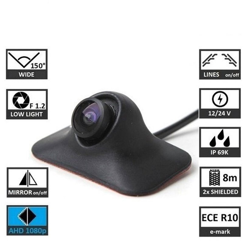 Cámara de aparcamiento universal , resolución FullHD 1080p – señal AHD , se puede utilizar como cámara frontal sin líneas guía o como cámara de aparcamiento , ángulo de visión 150° , montaje en superficie plana mediante cinta 3M. Para la conexión, utilice un monitor compatible con AHD (p. ej. TFT5A2, TFT7HD2, TFT MIRROR7,…).