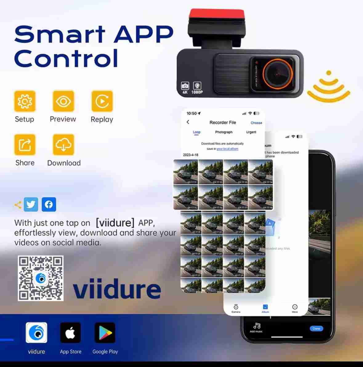 Conexión WiFi: conéctate a tu teléfono inteligente a través de la aplicación Viidure para monitoreo y reproducción de video en tiempo real.